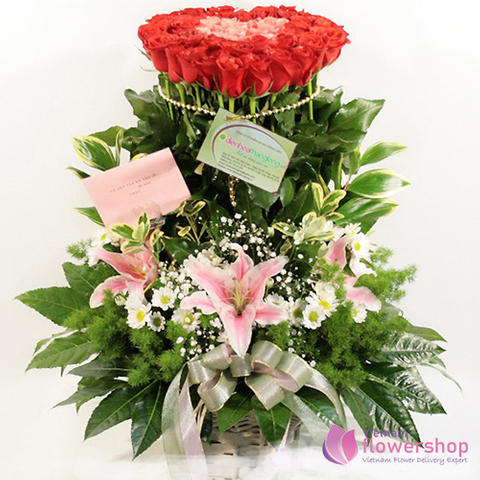 Basket of red roses mixed pink lily