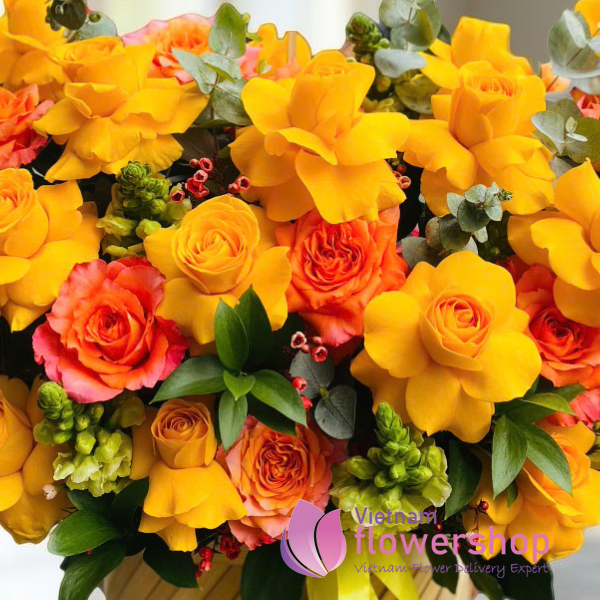 | Kind of flowers | Orange roses, yellow roses, snap dragons |