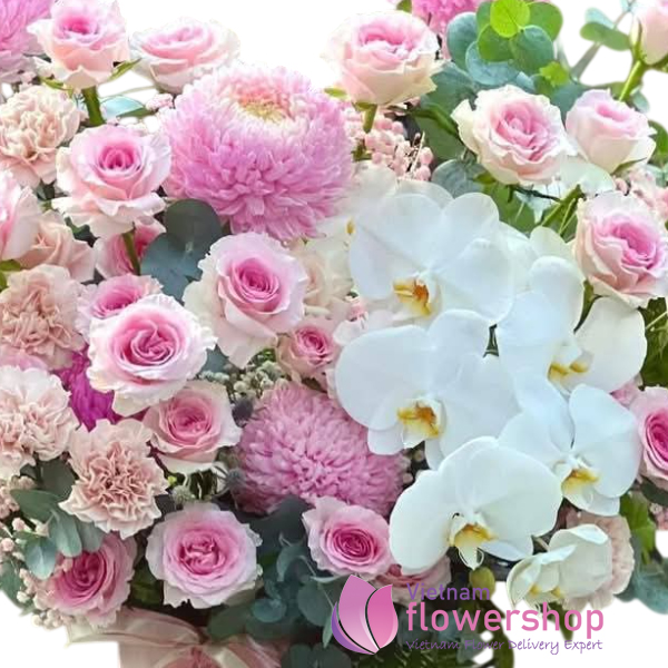 | Kind of flowers | Pink roses, phalaenopsis orchids, Peony Chrysanthemum. |