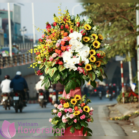 Grand celebration only comes once a lifetime. Whether is for a bussiness or wedding or function, this all-fresh flower arrangement is created to make a statement. Standing close to 1.8m tall and 0.8m wide. Arranged with a wide variety of premium flowers – phalaenopsis orchids, onccidium, roses, sunflowers, hydrangea, snapdragon flower, green fillers.