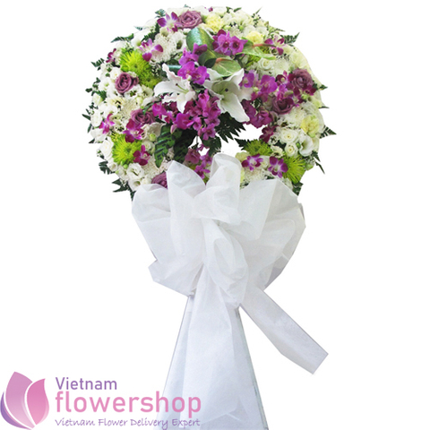 An elegant standing wreath with flowers of green, purple, and white garden florals including rose, daisy, lily, green wicky, lisianthus, mokara orchid and deluxe floral greenery. An excellent way to express your sympathy.