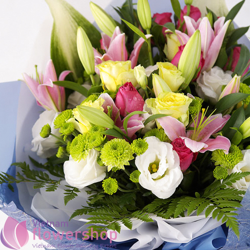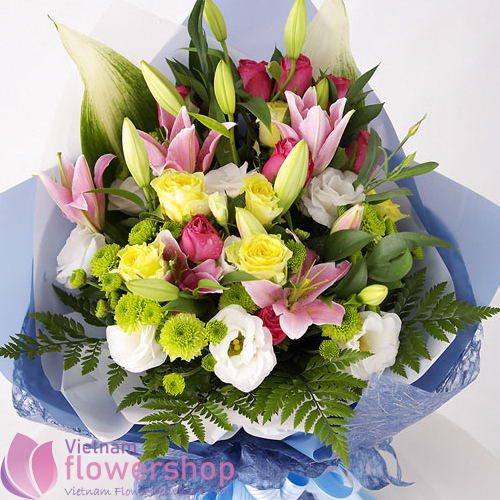 This is a classic piece of arrangement of many flowers in just one bouquet. In this bouquet you will get pink lilies, yellow rose, lisianthus, green daisies with seasonal filler packed in a blue paper and tied up with a blue ribbon. Send this mixed bouquet to someone special for expressing your feelings.