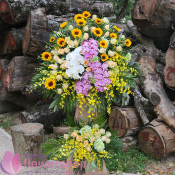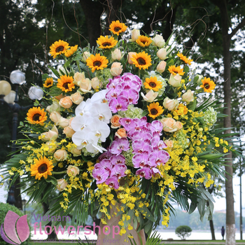 This bouquet will speak to your feelings loudly and proudly. Good choice to send your blessing for friends with a new store opening. This chief flower of this opening congratulation flowers stand is roses, sunflowers, phanaenopsis orchid, hydrangea with matching flowers and greens.