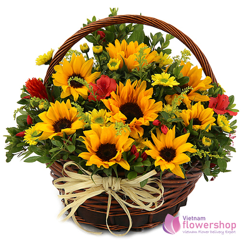 Bring smiles with this cheery basket of arrangement of sunflowers and daisies.