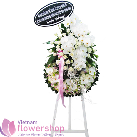 White flowers have a peacefulness and purity to them, bringing hope and light during a time of loss. Our impressive standing arrangement, meticulously handcrafted by expert florist, with an abundance of pristine white blooms that comprises of Moth Orchid, white rose, Hydrangea, Calimero… Let it be a grand and memorable tribute to one who was loved so dearly. Condolence grand stand comprises of exotic flowes, with 1.8m height.