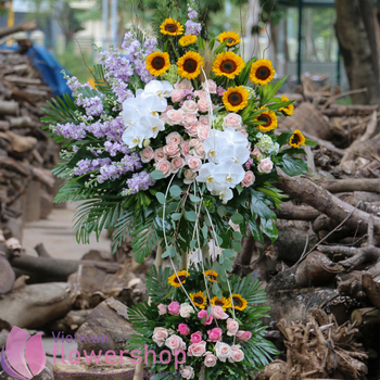 There are many types of flower in this colorful flower stand. Our florist specially arrange the roses and phalaenopsis to make a graceful shape, in order to draw guest’s attention. The main flowers in this stand are sunflowers, pink roses, delphinium, Phalaenopsis orchids, hydrangeas accessorized with other flowers and plant leaves.