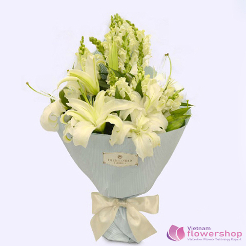 The bouquet is a brilliantly beautiful arrangement to bring peace and comfort to your friends and family in their time of need. White lilies, snapdragons are offset by lush greens to create a lovely display of sweet serenity.